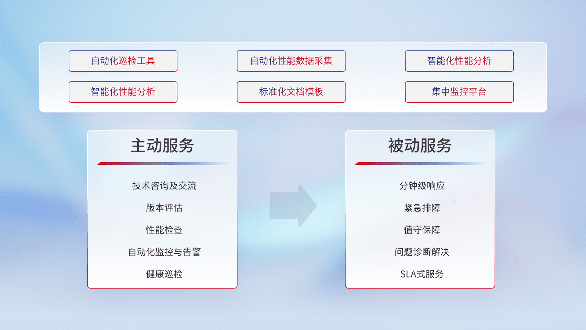 智能化工具和标准化文档,,,,保障服务质量,,,提供主动服务(包含技术咨询、、、、版本评估、、性能检查、、自动化监控与告警、、、健康巡检)和被动服务包含(分钟级响应、、、紧急排障、、值守保障、、问题诊断解决、、、SLA服务)。。。。