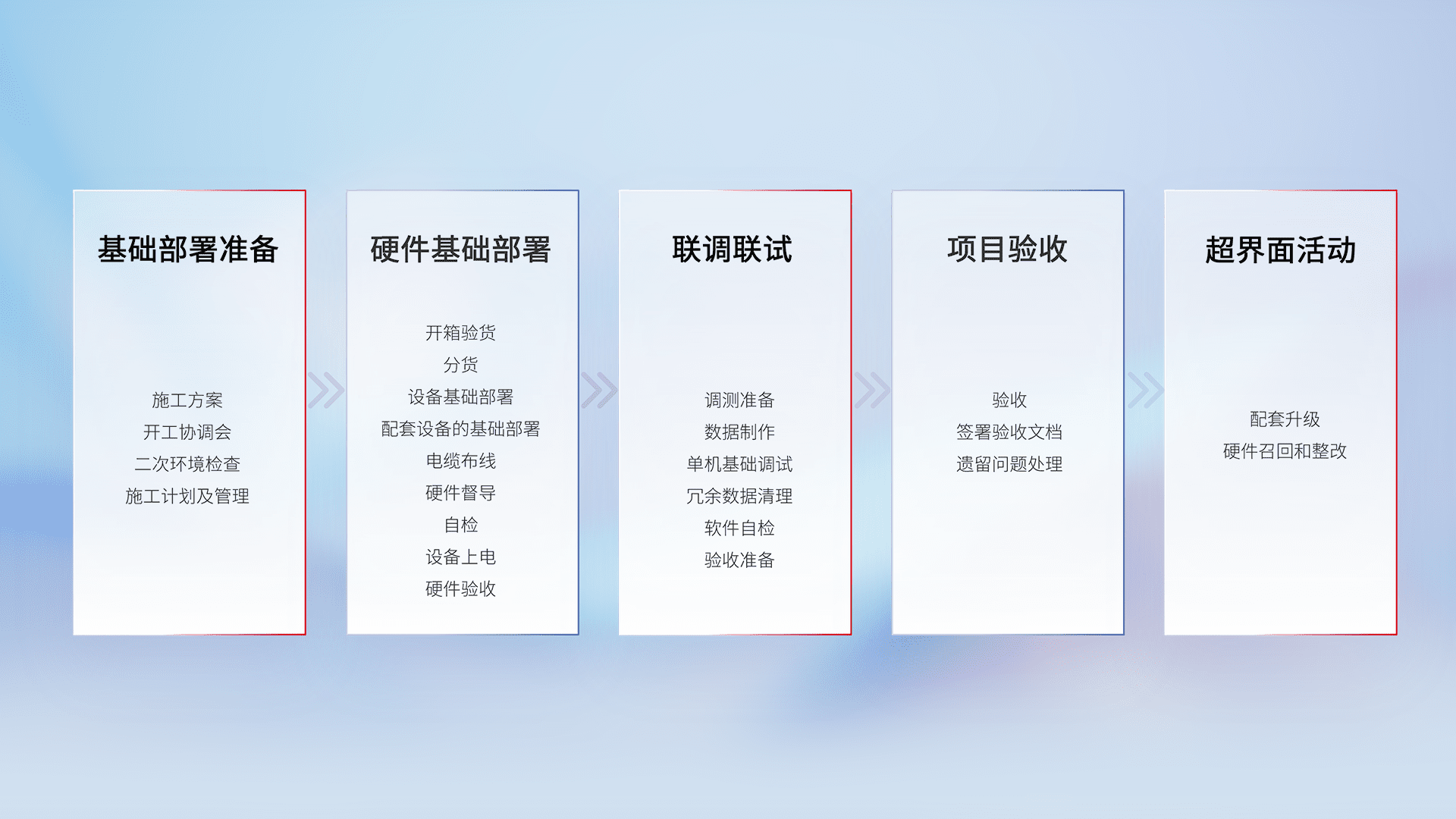 从基础部署准备、、、、硬件基础部署、、、联调联试、、、、项目验收、、、、越界面活动的全过程可追溯,,保证施工质量和进度。。。。